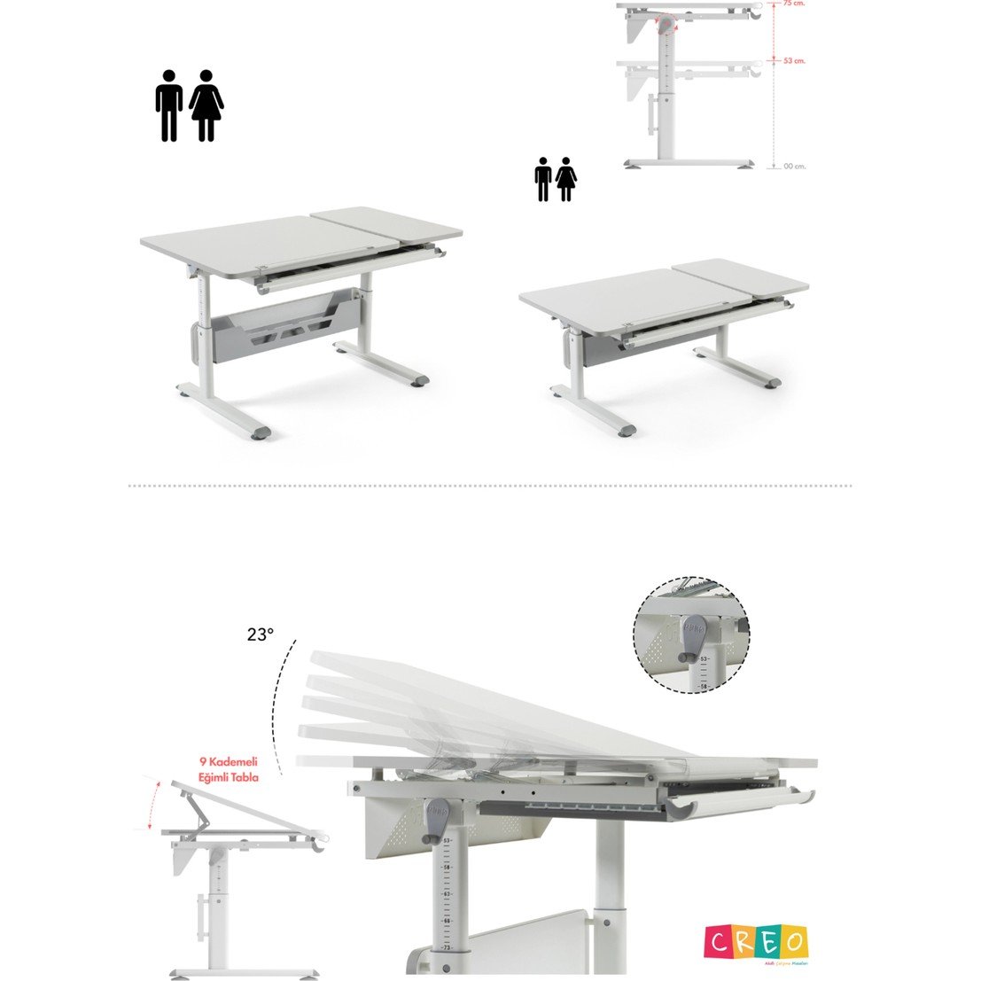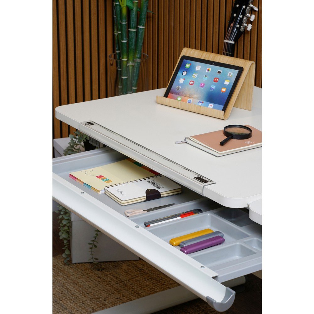 Yükseklik ayar mekanizması ile çocuğunuzun boyuna uygun çalışma pozisyonu sağlanır. 0-25 dereceye kadar eğim verilebilen masa tablası, yazı yazma, boyama ve kitap okuma gibi etkinliklerde konforu artırır. Entegre çekmece ve masa düzenleyici tepsi, kırtasiye ve hobi malzemelerinin düzenli bir şekilde saklanmasını sağlar.